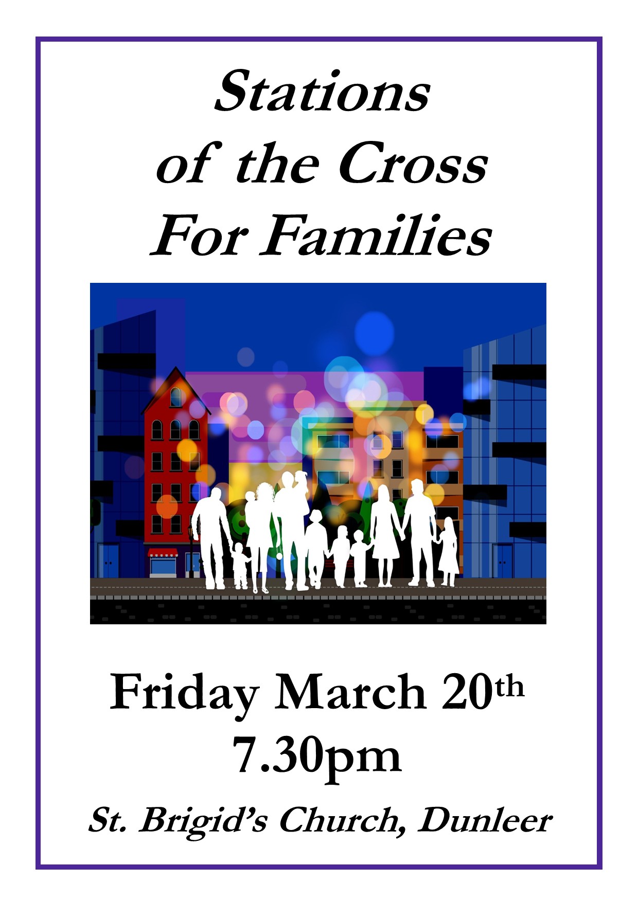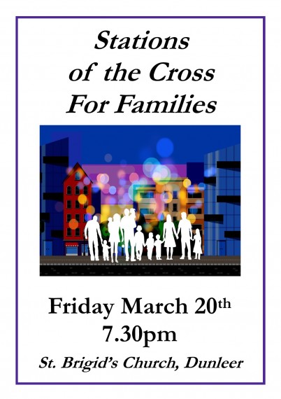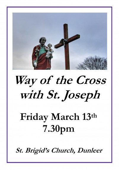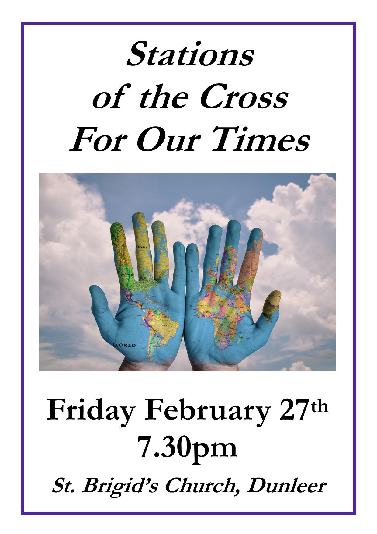Stations of the Cross in St. Brigid’s Church each Friday at 7.30pm, with a different ‘theme’ each week – see below.