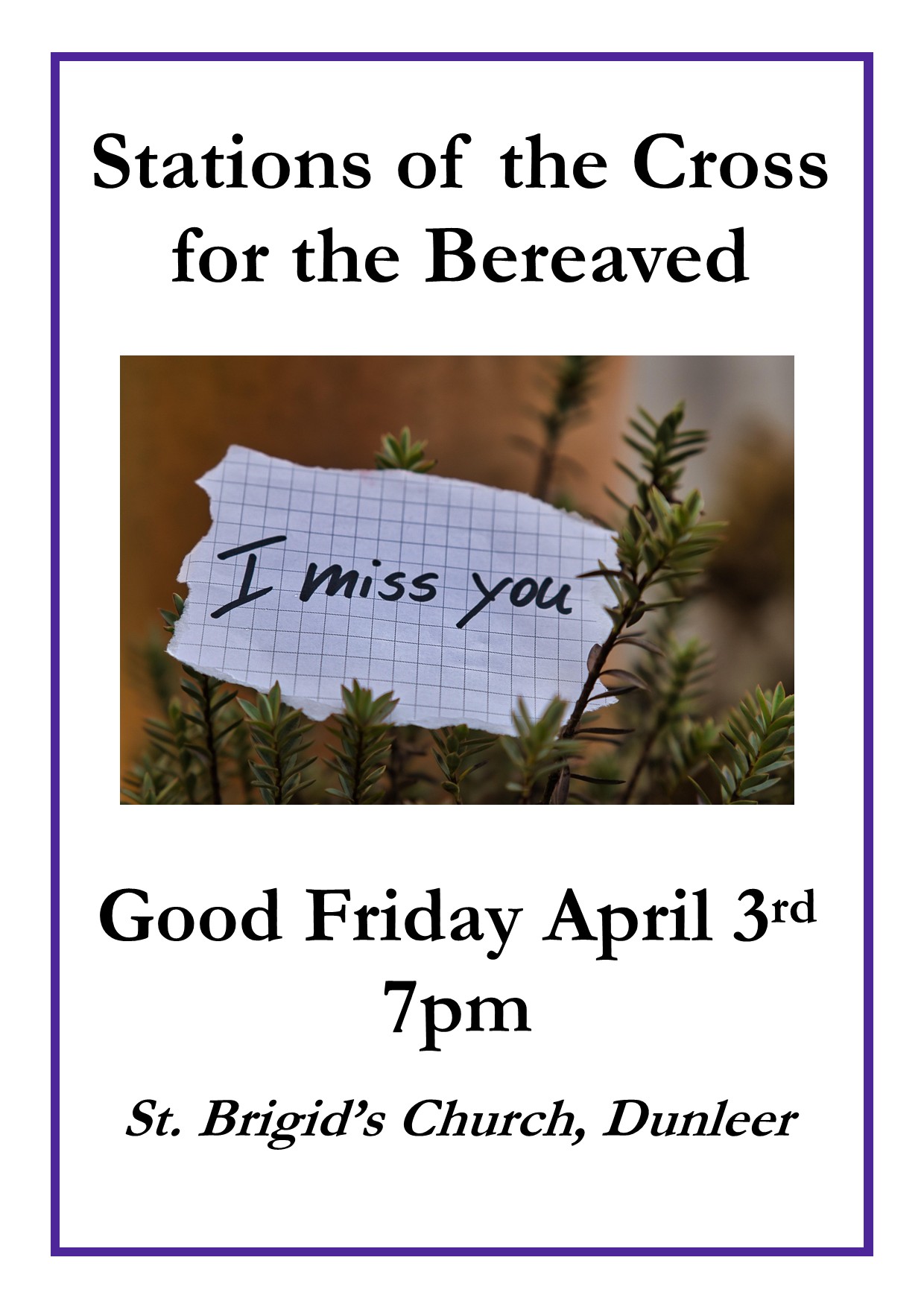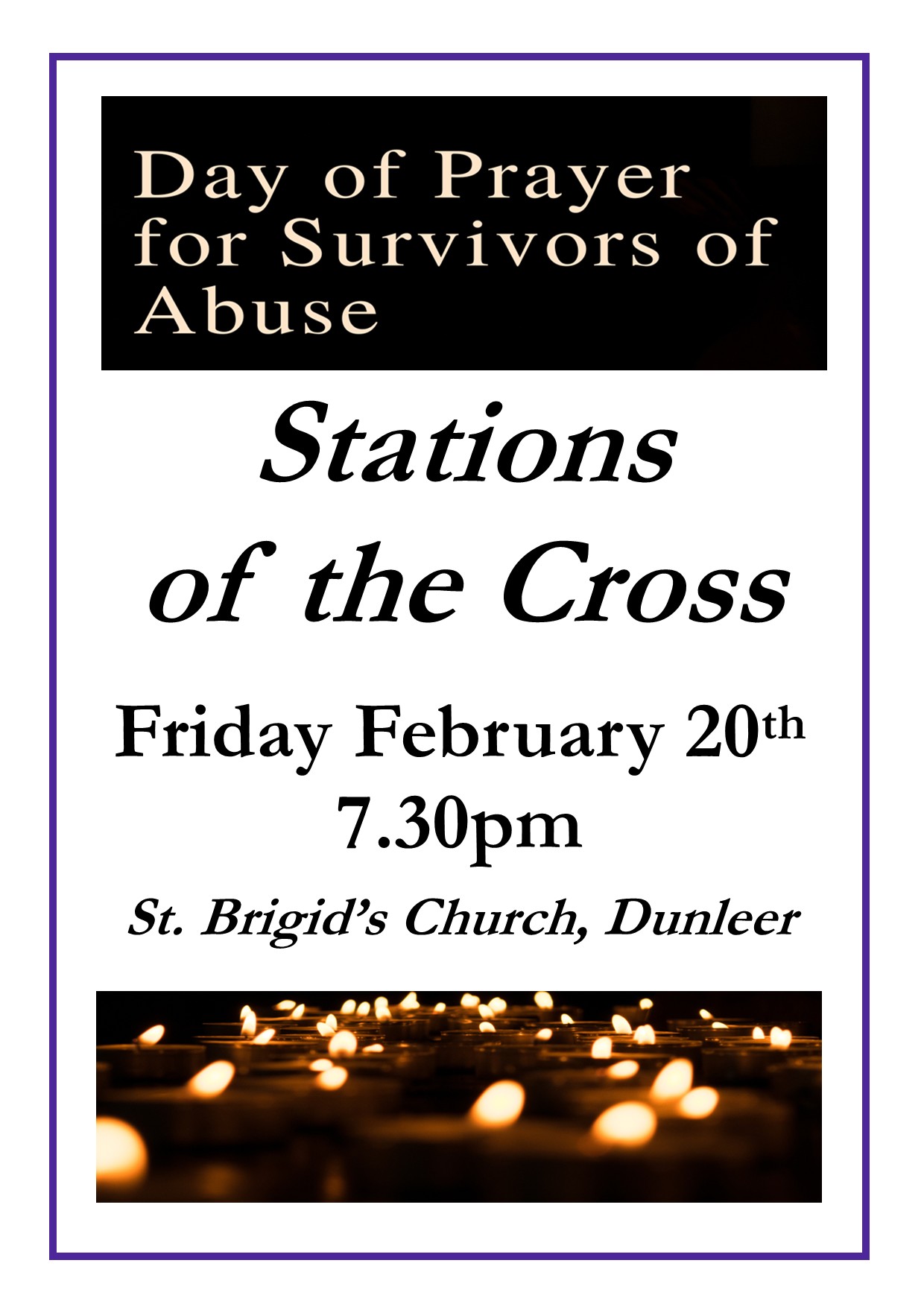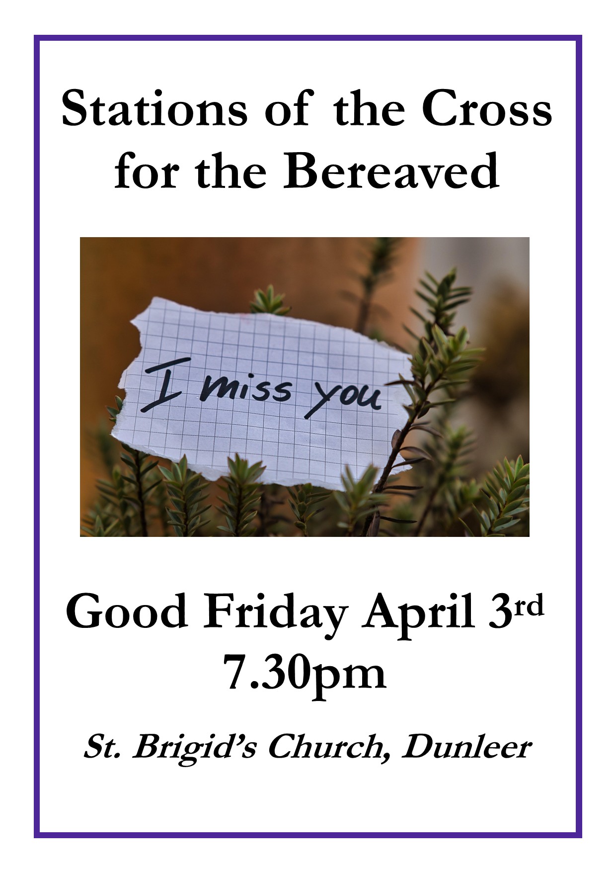 Stations of the Cross in St. Brigid’s Church each Friday at 7.30pm, with a different ‘theme’ each week – see below.